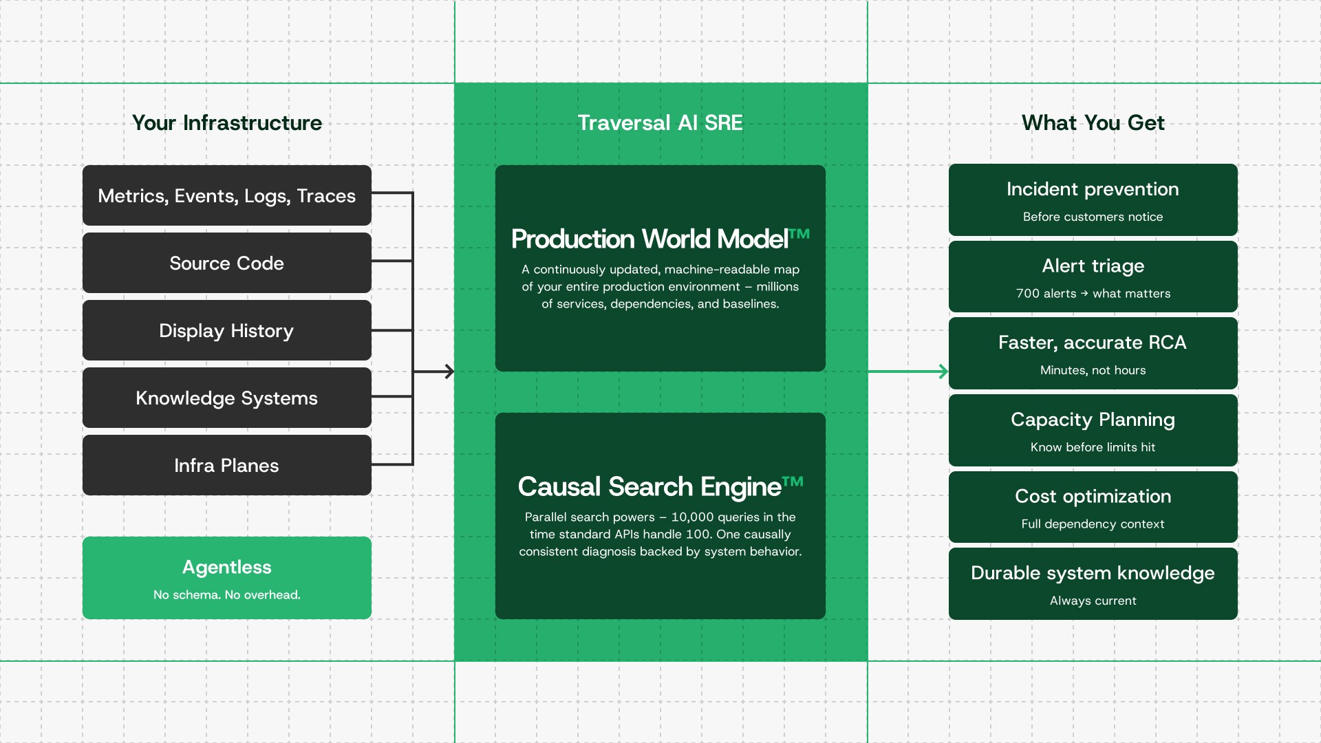 Traversal's Production World Model™ isn’t the product. It’s the architectural foundation for what we call self-driving production: a system that autonomously detects, investigates, diagnoses, and remediates complex failures across your entire environment, at enterprise-grade speed and accuracy, so your engineers can focus on building rather than firefighting.