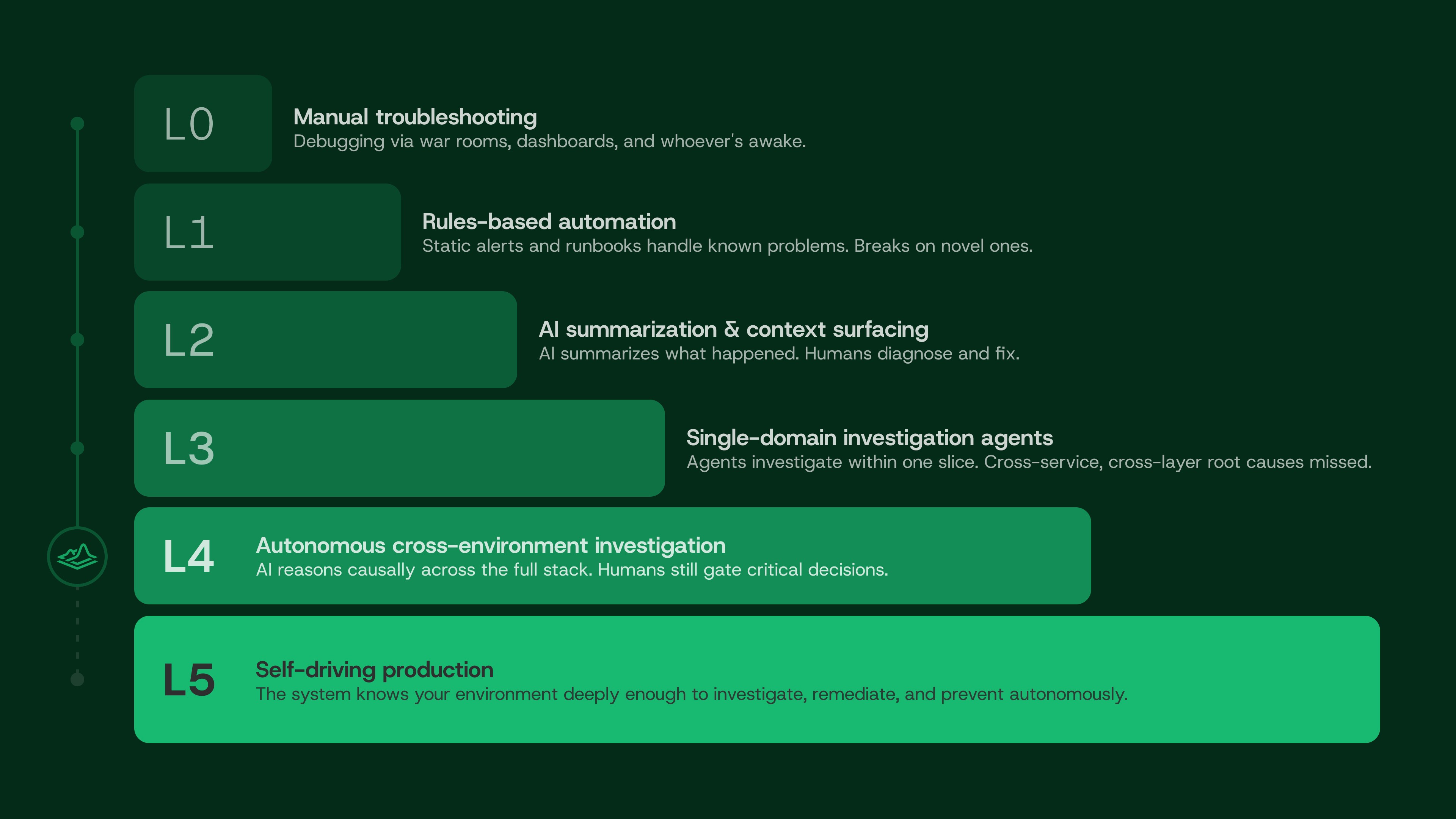 L5 is the destination: self-driving production. Here, the system has internalized your environment deeply enough to act on its own: not just detecting and diagnosing, but remediating issues as they arise and preventing them before they surface. The system doesn't page you at 4AM with a diagnosis. It fixes the problem, verifies the fix, and briefs the engineer in the morning. Engineers stop firefighting and go back to building.
