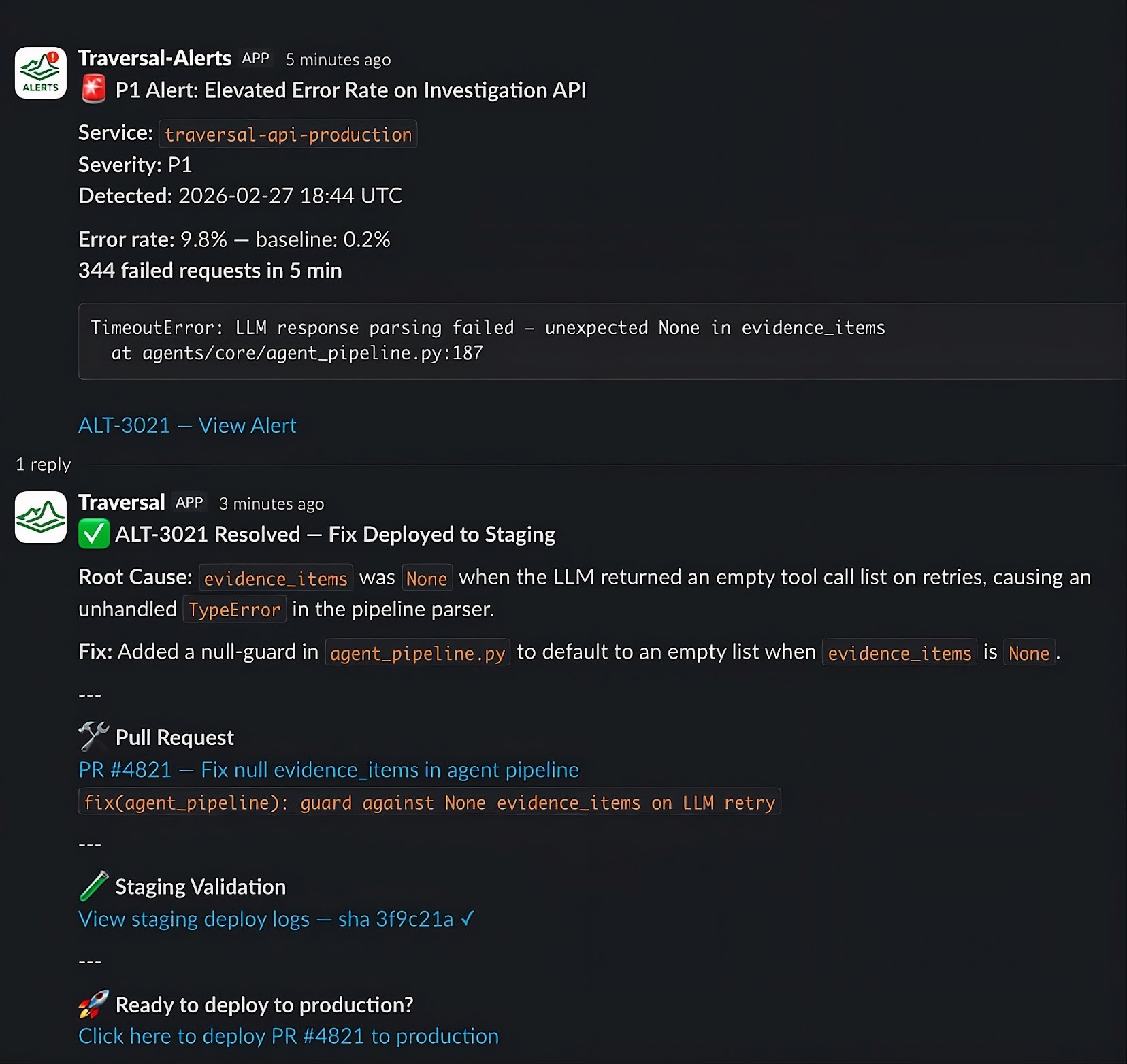 Traversal detects an issue in its own production environment: an error spike, a degraded endpoint, a flaky integration. This is powered by Alert Intelligence, a long-running agent that continuously watches every alert in the environment.